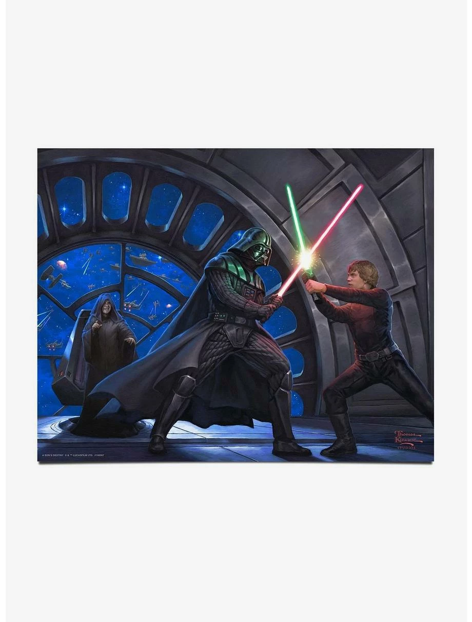 The space battle between the Imperial TIE Fighters and the Rebel X-wings continue behind Emperor Palpatine who is enthralled by the Lightsaber duel of Darth Vader and Luke Skywalker. Is this the final encounter for father and son? The Emperor encourages Luke to kill Darth Vader and to take Vader?s place at his side. Luke declares that he is a Jedi Knight as his father Anakin Skywalker was before he turned to the dark side. An enraged Palpatine states he will then himself kill Luke. The Emperor?s action brings Darth Vader to realize he needs to save his son Luke, only to lose his down life. In ?A Son?s Destiny? by Thomas Kinkade Studios good finally does conquer evil. Thomas Kinkade Studios Prints are packaged in a collector?s sleeve with an official Thomas Kinkade Studios Certificate of Authenticity, featuring a tamper-evident holographic seal. Printed on high quality 11? x 14? Satin Art Paper, they are ready to frame in any standard-sized presentation, making them the perfect gift for someone special or an excellent addition to your personal collection. Features long-life pigment inks that outperform conventional press inks, and shipped flat in rigid packaging.