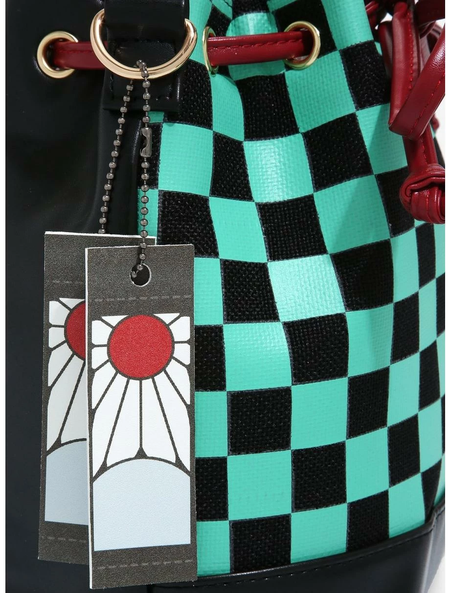 Slay the fashion game! Complete your Demon Slayer fit with this bucket bag, inspired by Tanjiro Kamado’s checkered black and seafoam green haori from the iconic anime. Finishing touches include a drawstring opening, charm modeled after a hanafuda earring, interior zip pocket, and striped adjustable crossbody strap.